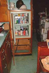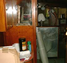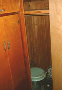 | This is the galley with the ice box open. The trailer had been used for storage for the last few months at this point in its life. to the right is the sink and stove. to the left is open counter. | The bedroom closet has a small toilet, no holding tank. Very tight quarters. |