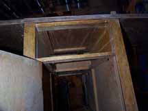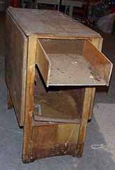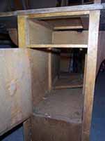 | There is a drawer on each end. The drawer box is made up of plywood. The box itself measures (outside measurements) 10 ½" wide x 12 ¾" long x 4 3/16" deep. The drawer face is missing, but would have been 10 11/16" wide x 4 ¼" (or 4 3/8") high. The underside of the top "frame" (part A from earlier) has a small "stop" attached to it against which the back of the drawer face would rest. |