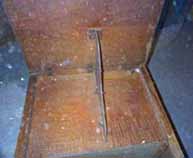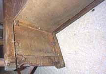 | The bottom panel is cut from ¼" plywood and measures 25 7/8" x 10 ¾". It simply attaches by dropping it inside the legs so that it comes to rest on top of the crossbar (at 19"). It is then attached with brads (and I presume glue). The "benefit" of having it sit upon the crossbar rather than being flush with it (as you or I might design it) is that the edge of the panel then serves as the stop for the cabinet door. The side plywood panels are nailed into the end grain of this ¼" plywood with brads. The brads here are not really doing anything structurally, since the side panels are attached at top into solid stock and to the legs and the bottom panel is nailed to the crossbars at 19" from top of leg. |