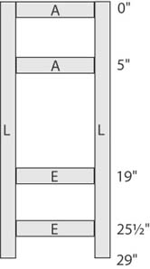 The top and center frames are placed at 0" and 5" heights, measuring from the top of each leg down to the top of each frame. In the diagram below, "L" represents each leg and "A" is the end of the frame discussed earlier. |